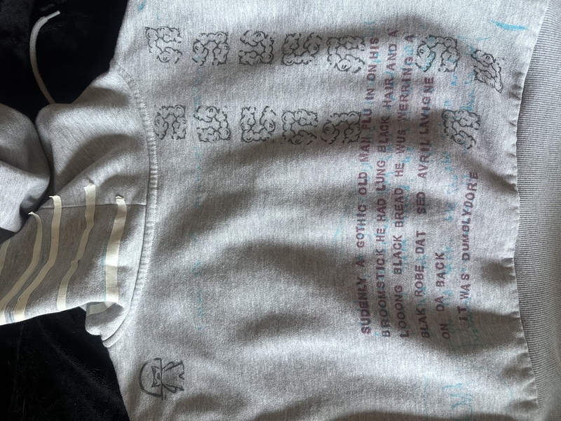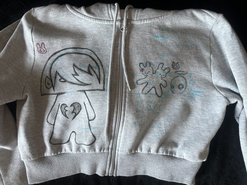 Tomorrow I’ll be adding some drawings to the front of the grey hoodie. After, I’ll do a little stamping, and add more quotes from my immortal. If I have some time I’ll probably spray paint black stripes on the hood too.