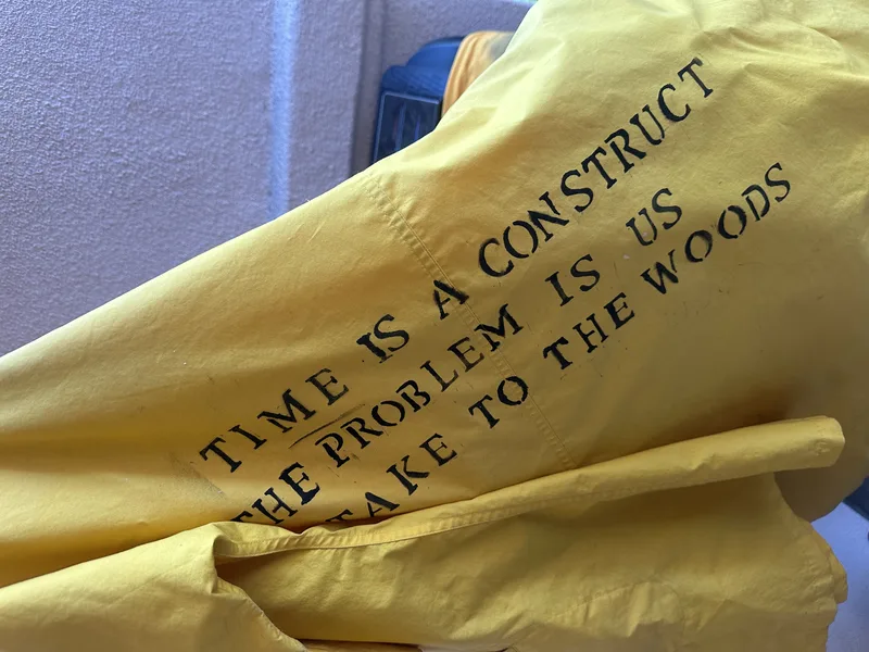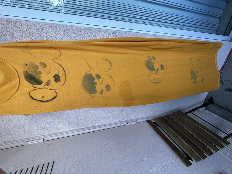 I got a chance to personalize with some spray paint this past week. I added text to the back of my yellow rain slicker. I added some heads to a really long yellow dress. I was thinking of creating kind of a 3D effect by spraying another outline, near the initial, but just in another color. There's a sizeable stain on the side- maybe the heads will obscure it. I only did one side of each, but I plan to add more this upcoming week.