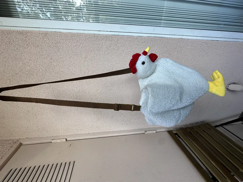 sketchbook, chicken purse, & rain slicker